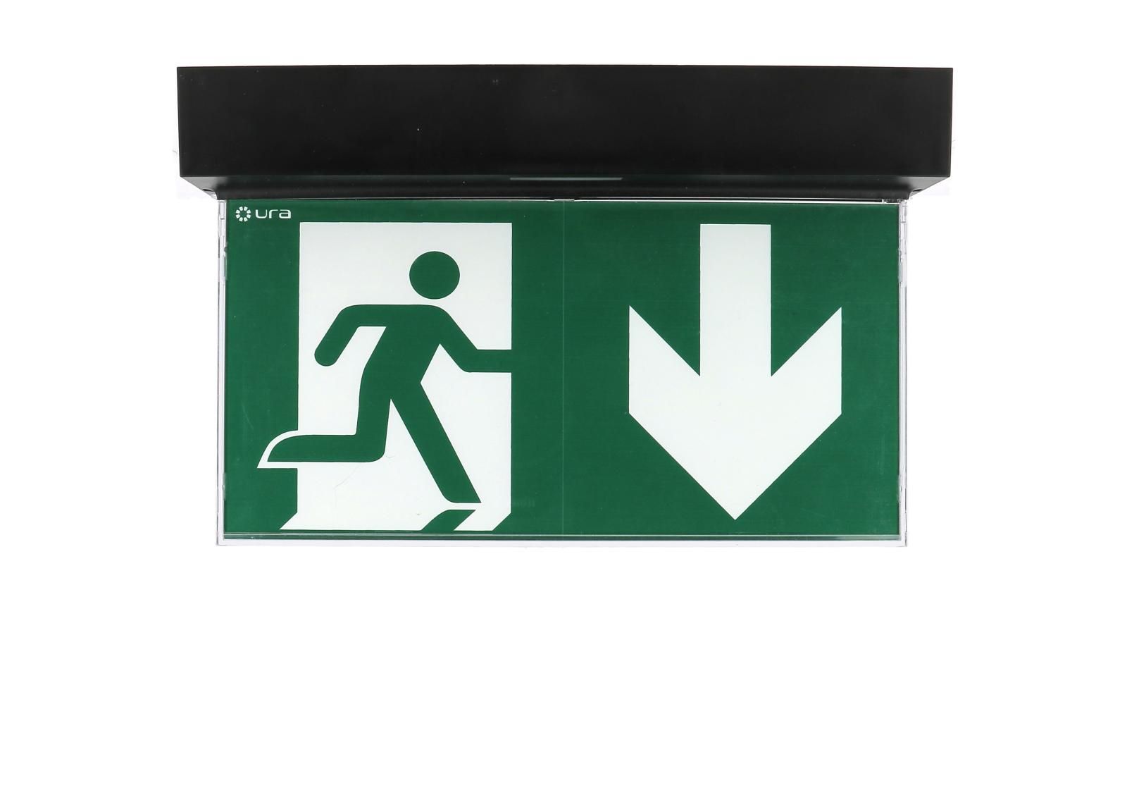 Un Design Noir parfaitement intégré, réduit à sa simple fonction avec un pictogramme d'évacuation lumineux sans bordure éclairé uniformément